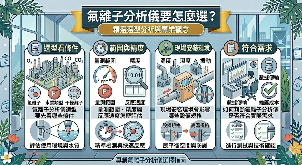 導入前,建議先確認:第一,實際濃度範圍與應用場景;第二,樣品是否有 pH、溫度或干擾離子問題;第三,需不需要線上輸出、系統整合與連續監測;第四,校正液、TISAB、電極等耗材與售後支援是否容易取得。這些條件先釐清,選型會準很多。